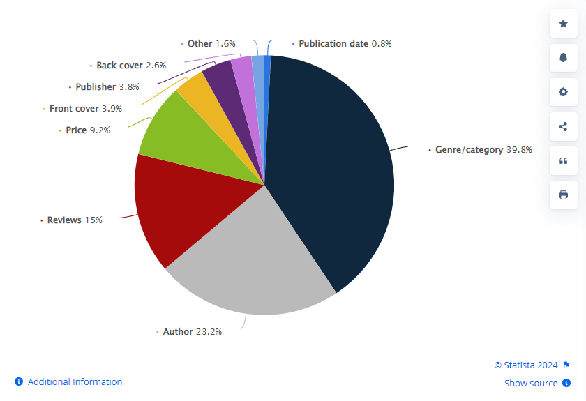 According to Statista, the most important factor for readers when choosing their next book is the category/genre of the book – 39.80% of readers consider it the most important factor. About 23.20% of readers primarily choose the book based on its author, considering the book’s author as one of the factors when picking the next read.